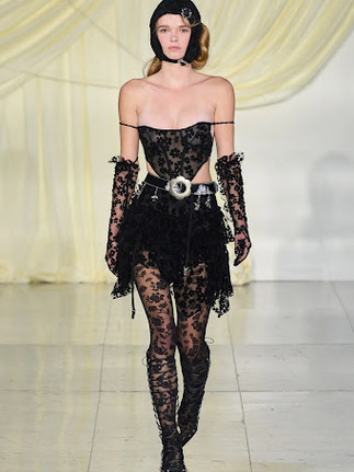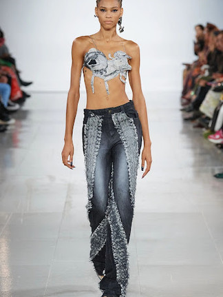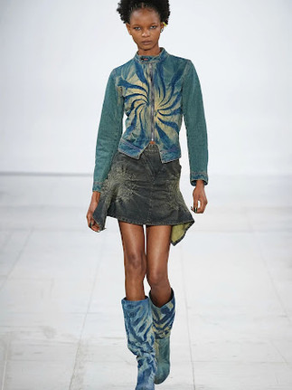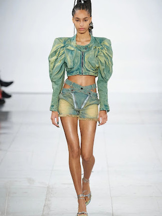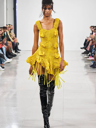 Ukrainian-born womenswear designer Masha Popova already made a name for herself across social media from her versatile daring denim designs and butterfly-printed tops with A-list fans including Dua Lipa, Billie Eilish, Bella Hadid and Kylie Jenner. For her debut runway show, Popova channelled her rage to create a collection with dark energy and a central motif of tire treads. The line also included a strong Y2K influence with low-slung jeans, denim jackets, halter tops and mini skirts. This take on sensuality combined with playful turbulent draping and subversive use of materials are tools that she often uses to create feminine yet care-free garments. Having graduated from Central Saint Martins and previously interned at Maison Margiela and Celine, she uses her experience of growing up in an industrial area of Ukraine to inspire her perspective on fashion.