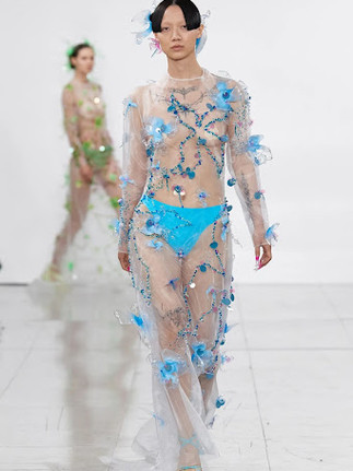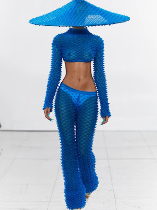 NewGen designer Chet Lo’s name was already known amongst the fashion crowds thanks to his signature sheer spiky knitwear being a favourite among Gen Z idols including Dua Lipa, Doja Cat and Kylie Jenner. The New York-born, London-based Asian designer’s debut solo show was a futuristic, colourful array of joyful hues, cultural clashes nodding to his East Asian heritage and trendy Y2K rave influences featuring his signature knits, low-slung waistlines, super-cropped styles, daring cut outs, delicate embroidery and draping dresses. First coming to London in 2015, Lo graduated from the Central Saint Martins’ BA Knitwear course, becoming fascinated with textiles and the endless possibilities and innovation that knitwear could bring. After interning at Proenza Schouler and Maison Margiela under fellow Saint Martin's graduate John Galliano, Lo went on to join the roster of young talent at Fashion East, where his debut graduate collection was received with critical acclaim, featuring in magazines Vogue, L’Officiel, W, Schön, Marie Claire, Crack and Dazed.